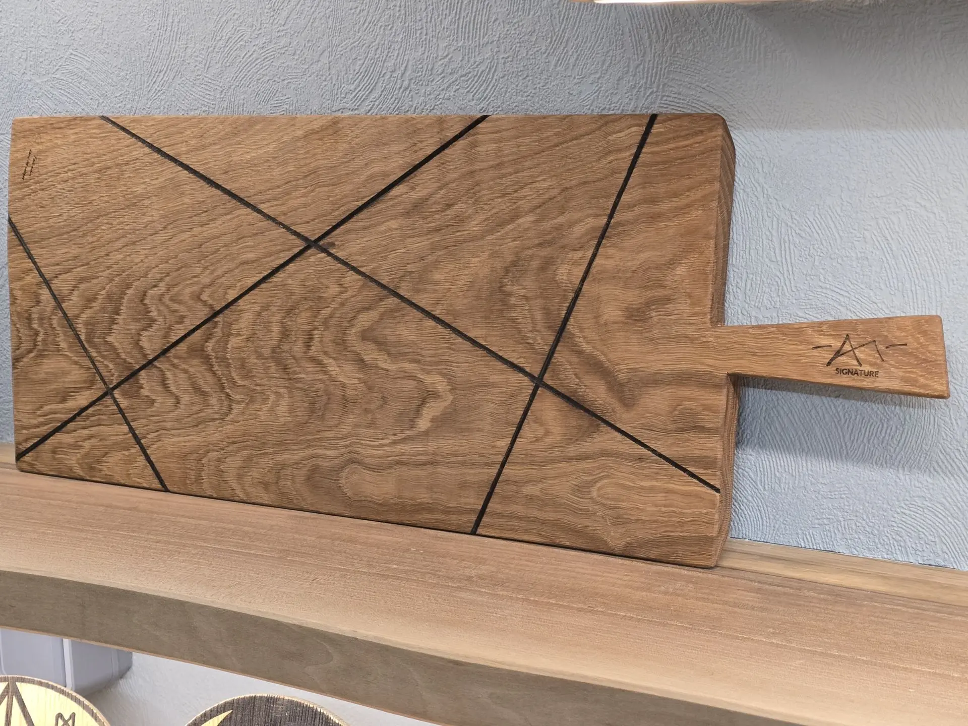 Avec un mélange vinaigre + paille de fer, infusé pendant 2 mois environ, on crée une réaction qui, au contact des tanins du bois (très présents dans le chêne), le fait foncer naturellement. Résultat : un noir plus “vivant”, où le veinage reste visible, plutôt qu’une couche noire en surface.
