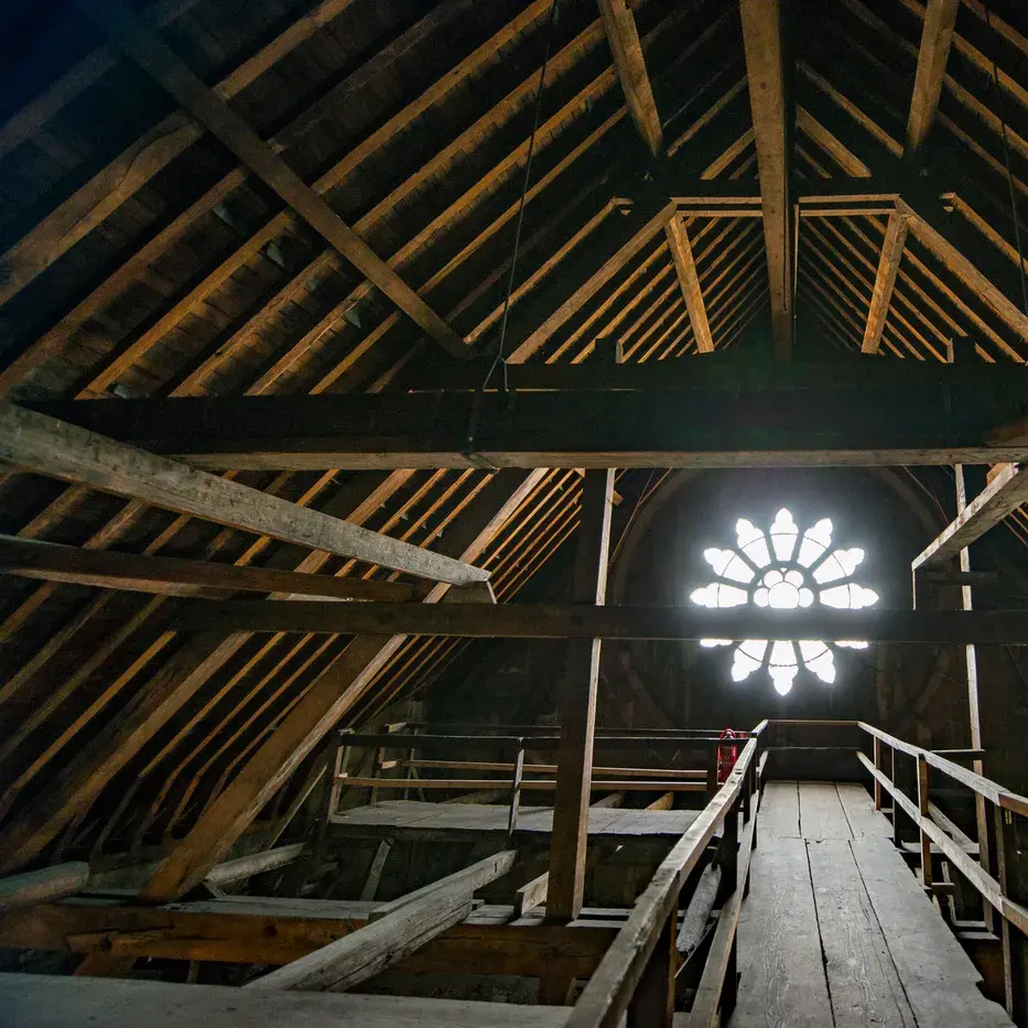 Après l’incendie de 2019, le choix a été fait de reconstruire le grand comble et la flèche avec les matériaux d’origine, donc en chêne massif (et couverture en plomb).